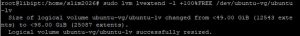 Terlihat di gambar bahwa partisi ada pada disk sda3 yang memliki 98GB namun yang sudah di map ke ubuntu–vg-ubuntu–lv sebesar 49GB. Partisi ini akan di perbesar menjadi 100%
